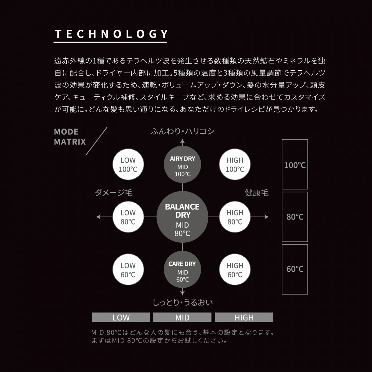 まずは図中央の基本設定からお試し頂き、しっとり保湿したい方は温度を1つ下げ60℃に、ふんわりハリコシがほしい方は温度を1つ上げ100℃でご使用ください。